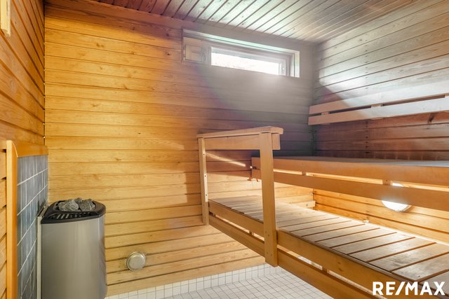 Asunnon alakerrasta löytyy keittiö, olohuone, yksi makuuhuone sekä iso kylpyhuone ja sauna.