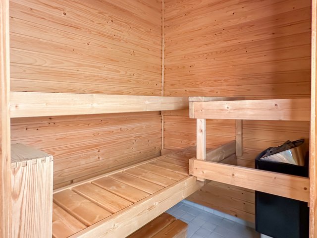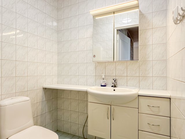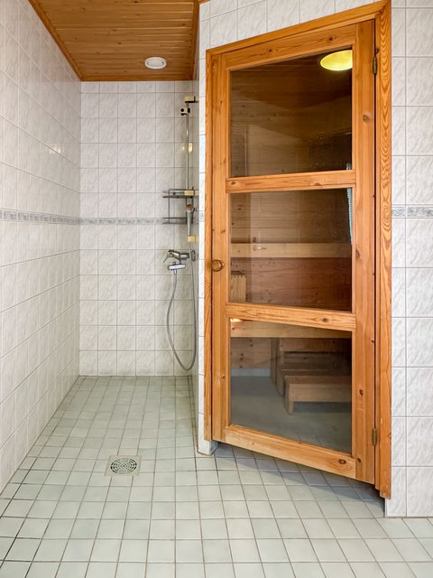 - Lattialämmitys, pesukoneliitäntä, pesuallas, allaskaappi, ja suihku
