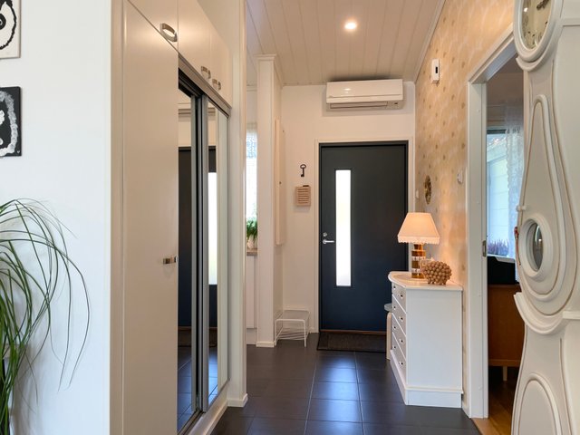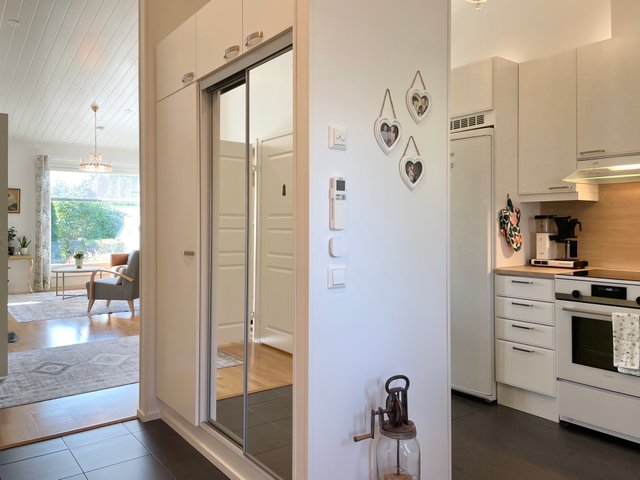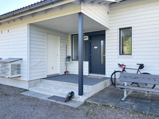 Sisäänkäynti asuntoon tapahtuu piha-alueen ja ison katetun etukuistin kautta, jonka yhteydessä sijaitsee myös huoneistokohtainen eristetty ulkovarasto. Tilavassa eteisessä on käytännöllinen laattalattia sekä iso kaapisto liukuoviosuuksin.