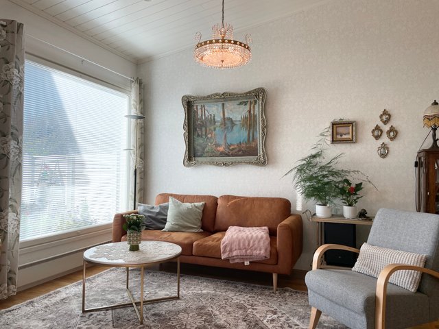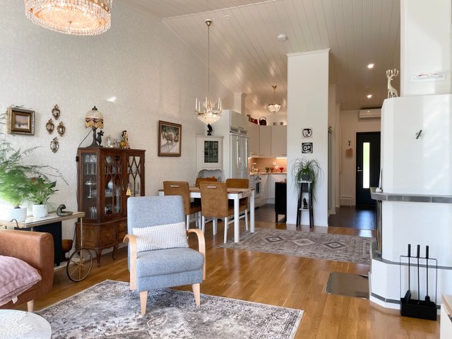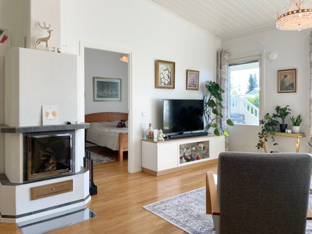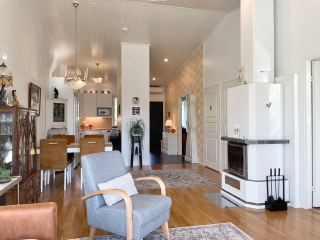 - Lattia parkettia, seinät maalattu/tapetoitu. Tilassa varaava takka.