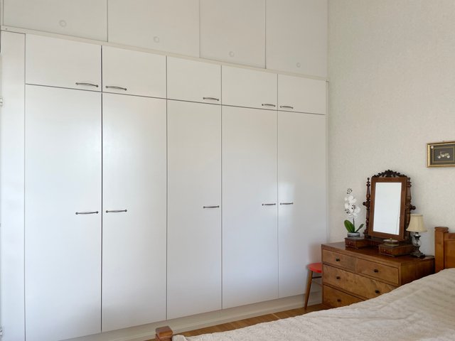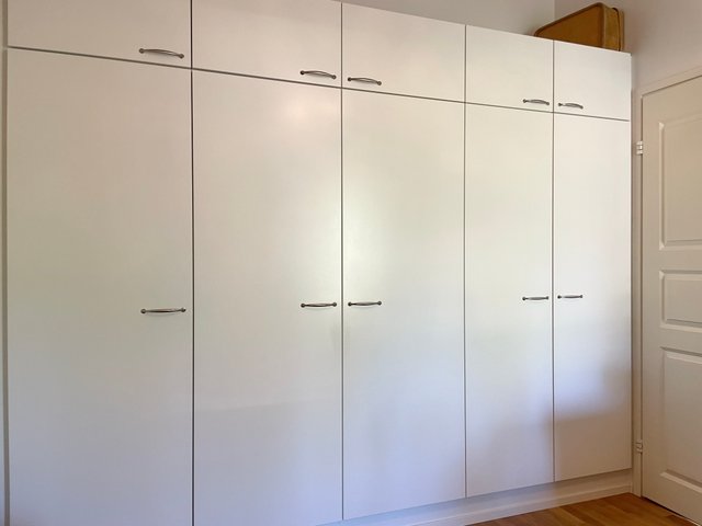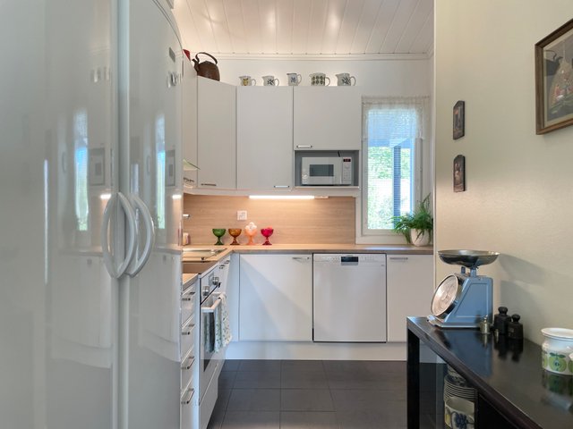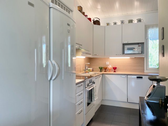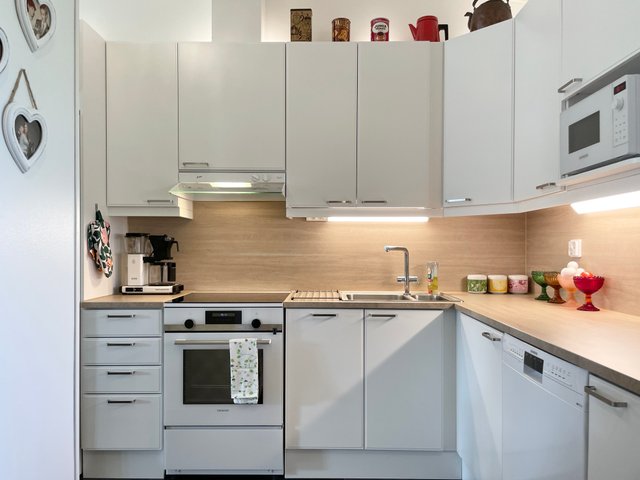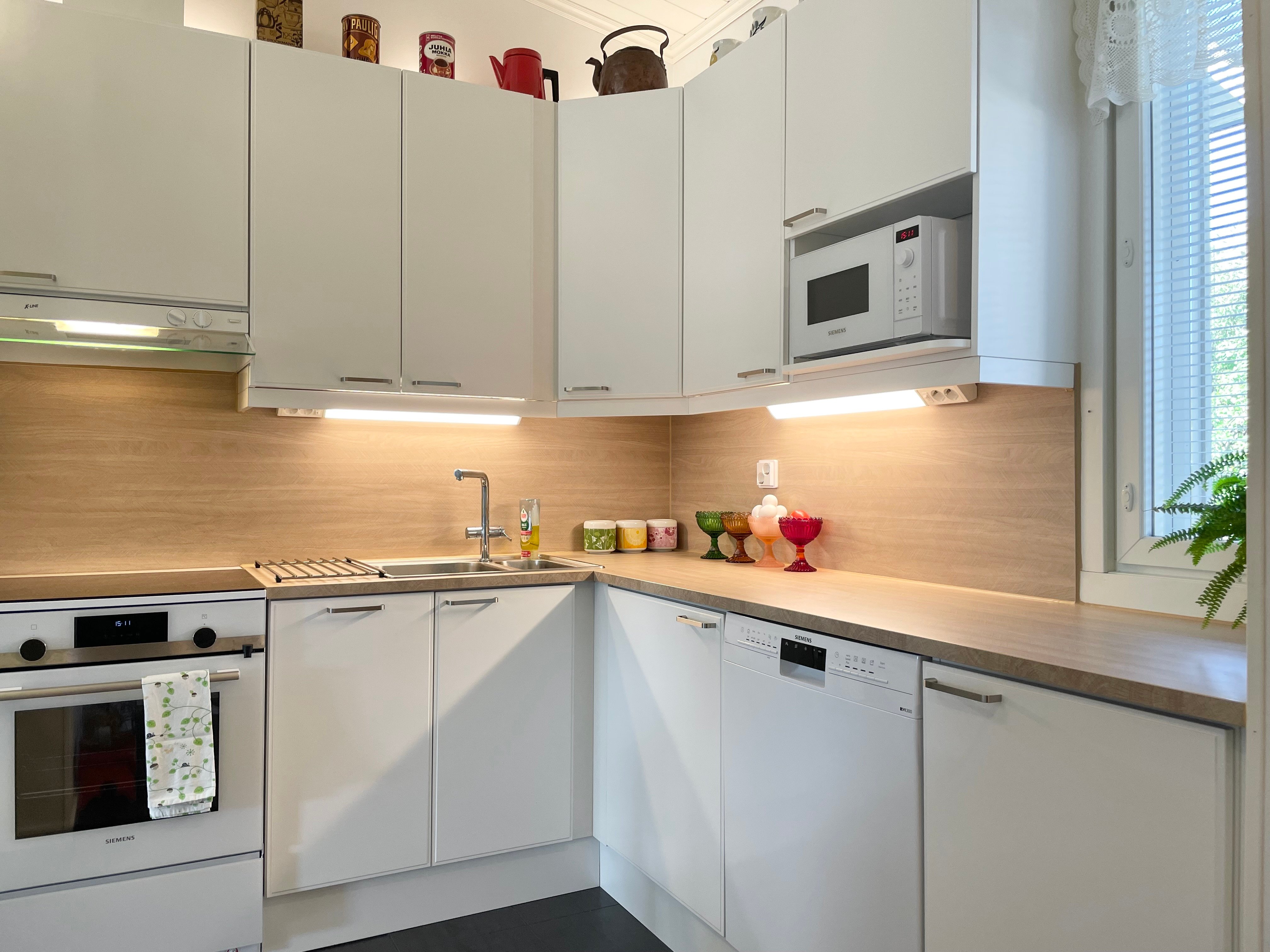 - Lattia laattaa, seinät maalattu. Kaapistot valkoiset, työtasot puunväriset, välitilassa levy. Korkea jääkaappi, korkea pakastin, astianpesukone 2020, induktioliesi 2024, liesituuletin, lattialämmitys. Keittiön kaapiston ovet, työtasot, välitin levy, tiskiallas, hana, valaistus uusittu 2024