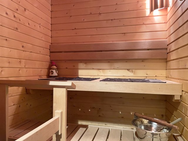 - Lattia laattaa, seinät paneelia. Kiuas, lauteet.