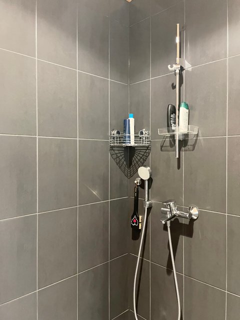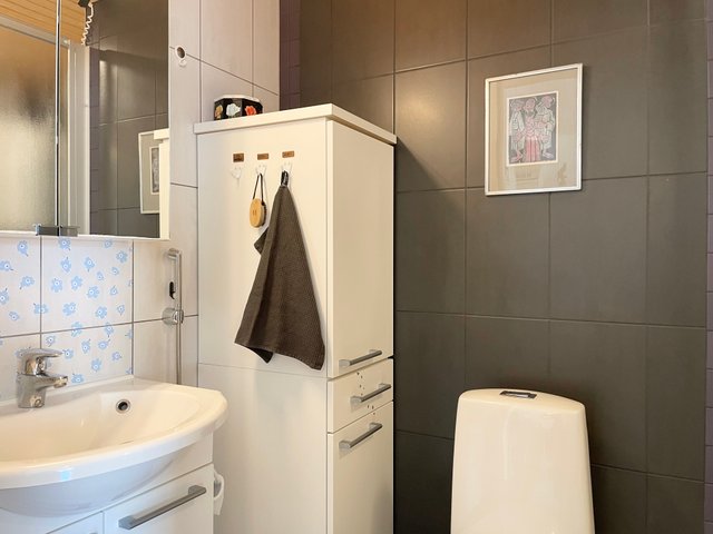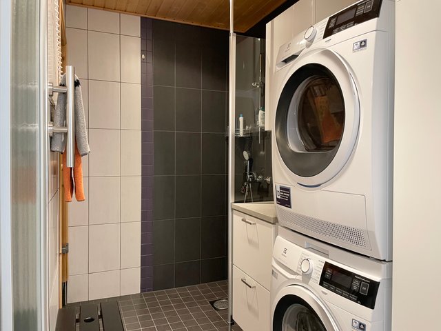 - Lattia ja seinät laattaa. Suihku (vaihdettu 2024), suihkuseinä (vaihdettu 2024), kaapistot (vaihdettu 2024), lämminvesivaraaja, ilmanvaihtokone, rättipatteri (sähköinen), pesukoneliitäntä.