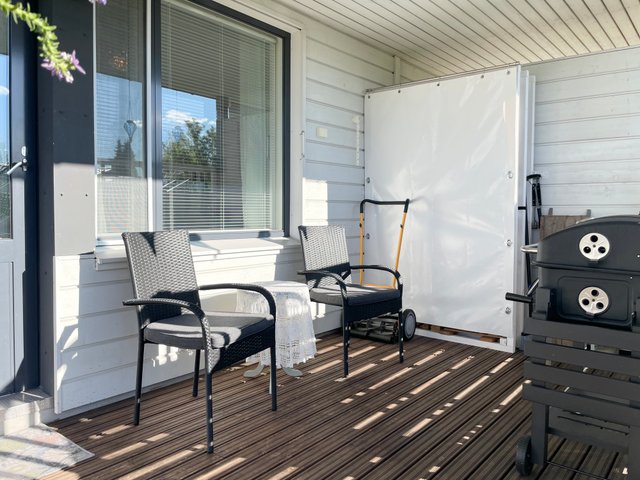Avara, viistokattoinen olohuone sijaitsee sisäänkäynnistä katsottuna asunnon päädyssä. Olohuoneessa on varaava takka sekä reilusti tilaa kalusteille. Olohuoneen päädystä kuljetaan suojaisalle, osittain katetulle koko huoneiston levyiselle takaterassille. Ilmansuunnallisesti noin lounaaseen avautuva terassi sekä sen jatkona oleva viihtyisä nurmipiha on aidattu sekä lauta-aidalla että istutuksin, jotka antavat mukavasti näkösuojaa joka suuntaan muutenkin suojaisalle takapihalle.