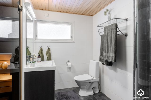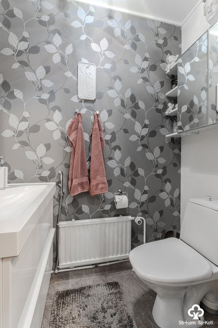 - WC-istuin, suihkuseinä, suihku, lattialämmitys, peili, ja allaskaappi