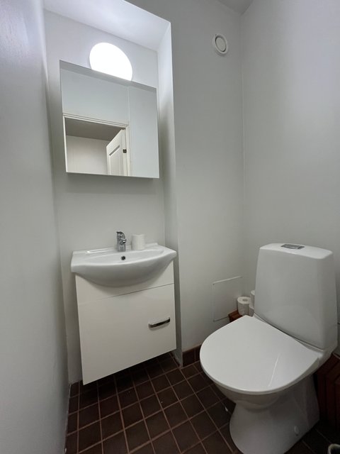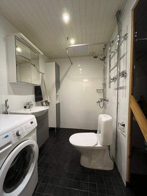 - WC-istuin, suihku, pesukoneliitäntä, lattialämmitys, peilikaappi, pesuallas, allaskaappi, ja bidee-suihku