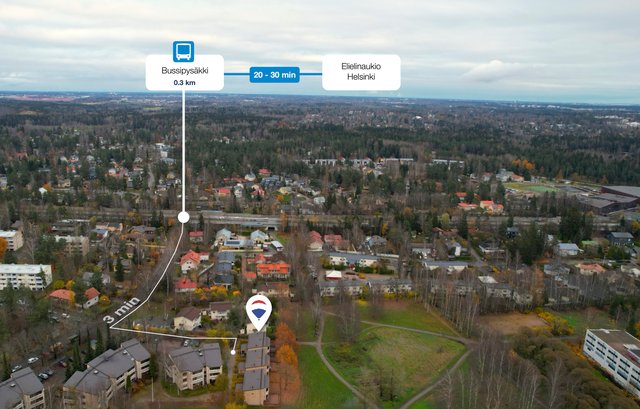 - BUSSIMATKAT: 0.3 km - Bussipysäkki Hämeenlinnanväylällä (Raitamaantie) 2-3 minuutin kävely bussipysäkille 20-30 min - Suorat bussiyhteydet Elielinaukiolle JUNAMATKAT: 0.8 km - Kannelmäen juna-asema alle 10 minuutin kävelymatka juna-asemalle 14 min junamatka Helsinkiin (I-Juna)