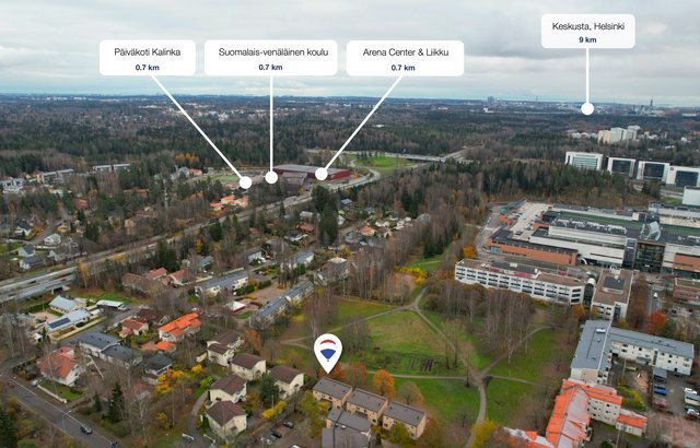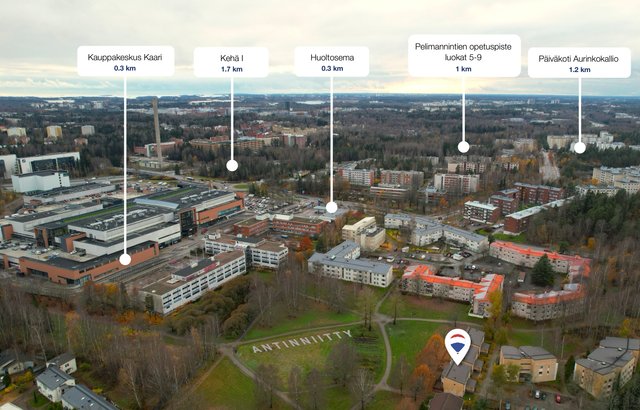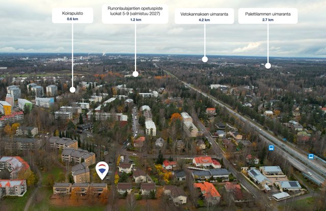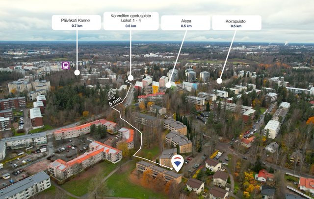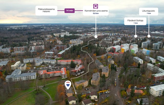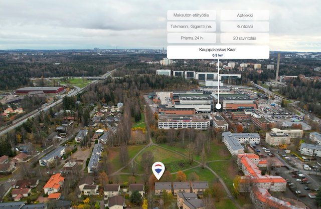 Sinulle, joka arvostat remontoidun kodin lisäksi nopeita liikenneyhteyksiä, lyhyttä koulumatkaa sekä edullisia ruokaostoksia ympäri vuorokauden! Takapihalta alkavan puiston poikki kävelee noin 2 minuutissa Kauppakeskus Kaareen, jonka Prisma on avoinna vuoden jokaisena päivänä 24/7. Kaaressa on noin 20 ravintolaa ja yli 50 muuta liikettä mukaan lukien lähin kuntosali. Erityisen hyvää tässä sijainnissa on myös Hämeenlinnanväylän bussipysäkki, joka sijaitsee vain 2-3 minuutin päässä kotiovelta. Bussimatkat Elielinaukiolle kestävät vain 20-30 minuuttia. Juna-asemallekin kävelee alle 10 minuutissa ja I-juna Helsinkiin on kestoltaan 14 minuuttia. Tämän kodin lähiympäristö on mieluisa myös pienten lasten vanhemmille, sillä alakouluun on vain 500 metrin helppokulkuinen matka. Kesäpäivät kruunaa noin 10 minuutin pyöräily uimarannalle. Tervetuloa Kannelmäen (a.k.a Kantsun) parhaille paikoille!