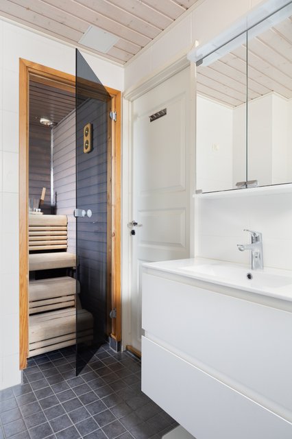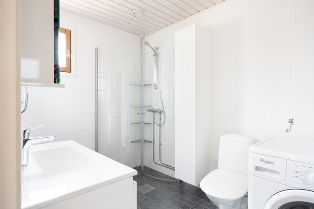 - Kylpyhuone on remontoitu vuonna 2012. Lisäksi kylpyhuoneen kalusteet on vaihdettu uusiin vuonna 2021. Suihkunurkan alueelta on myös vaihdettu laatta- ja silikonisaumat vuonna 2021 ja alueelle on lisätty nanopinnoite. Varusteet: wc-istuin, suihku, suihkuovet, bidee-suihku, allaskaappi, peilikaappi, vesikiertoinen pyyhekuivain, pesukonevaraus.