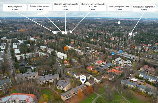 - 0.5 km - Kanneltie 1 (luokat 1-4) 0.9 km - Kaarelan Raitti 1 (luokat 1-2) 1.0 km - Kaarelan Raitti 3 (5. luokka) 1.0 km - Pelimannintie 16 (luokat 5-9) 1.2 km - Runonlaulajantie 40 toimipiste valmistuu vuonna 2027 (luokat 5-9)
