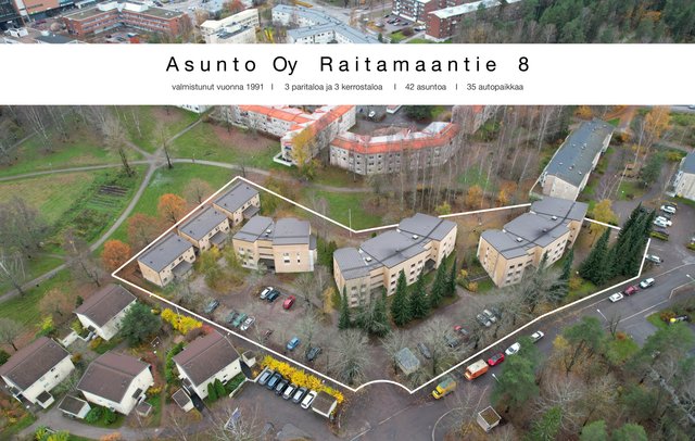 Asunto Oy Raitamaantie 8 on valmistunut vuonna 1991 ja se koostuu 3 paritalosta sekä 3 kerrostalosta, joissa on yhteensä 42 asuntoa. Tontin omistaa Helsingin kaupunki ja sen vuokrakulut sisältyvät normaaliin hoitovastikkeeseen. Tontin vuokrasopimus on voimassa vielä 25 vuotta vuoden 2050 loppuun asti. Taloyhtiössä on tehty hyvä määrä remontteja rakennuksen ikään ja suositeltuihin huoltoväleihin nähden. Merkittävimmät jo tehdyt urakat ovat olleet salaojaremontit, maalaukset, lukitukset, kattojen huoltokorjaukset sekä lämmönvaihtimen uusiminen. Suuria kunnossapitohankkeita ei ole toistaiseksi suunnitteilla ja putkistojenkin tekninen käyttöikäennuste (50 vuotta) ulottuu 2040 -luvulle.