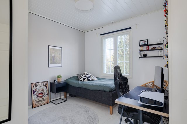 Asuintilat ovat yhdessä kerroksessa ja sen pohjaratkaisu on aivan loistava, ellei jopa täydellinen. Makuuhuoneita on peräti neljä, sekä näiden lisäksi yksi pienempi vaatehuone/työhuone, josta olisi mahdollisuus tehdä, vaikka vauvanhuone tai pukeutumishuone, jos etätyöt ei tule kuuloonkaan.