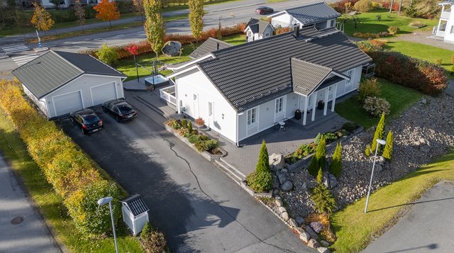 Huset ligger på en skyddad trädgårdstomt på 1 242 m². Mittemot finns ett planerat parkområde, så där kommer inget att byggas, och på två sidor finns redan en hög häck som ger bra insynsskydd.