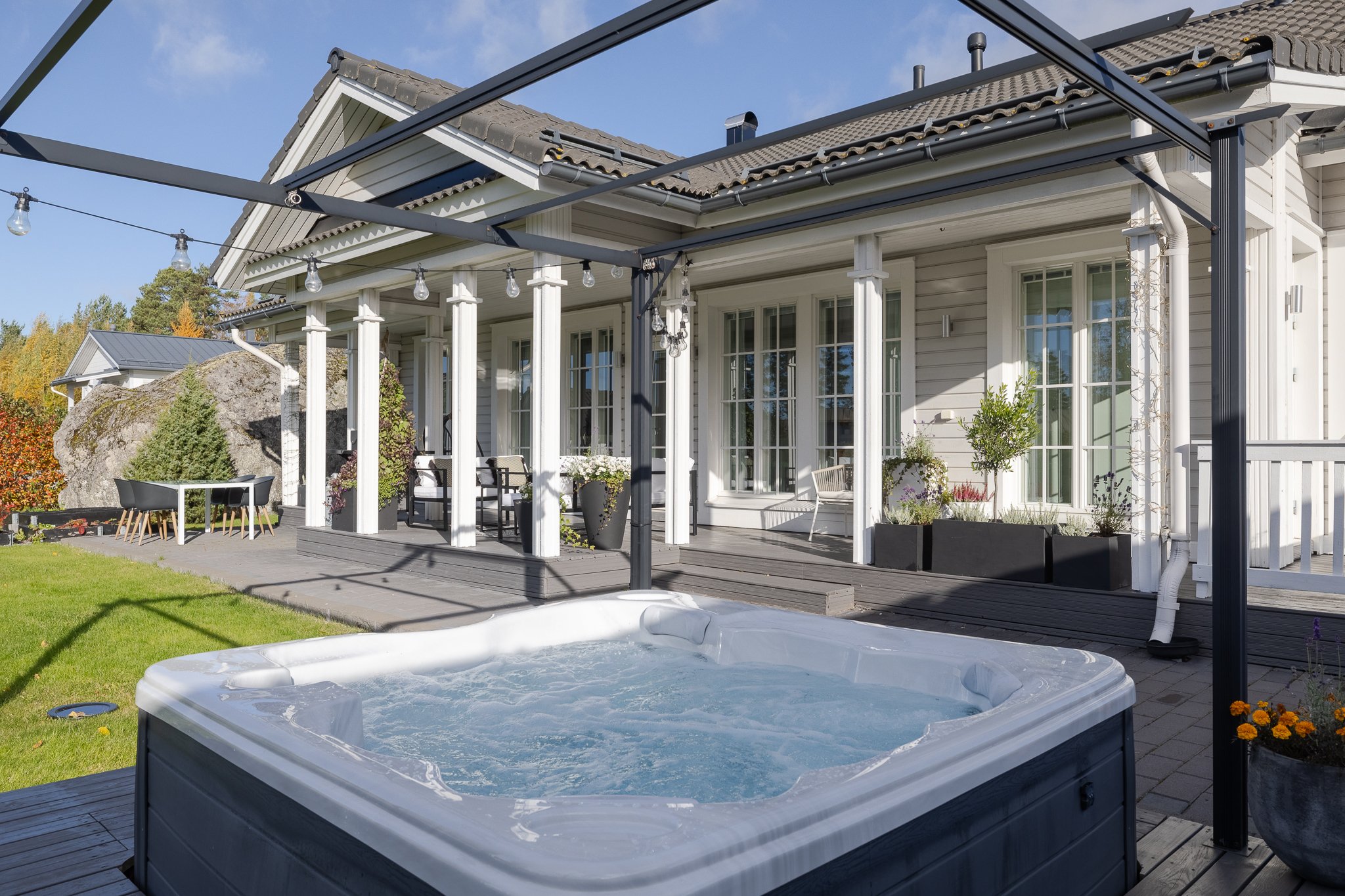 Tomten är plan och har gott om stenläggningar, planteringar samt både täckta och öppna terrasser – och dessutom ett utomhusspabad.
