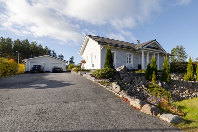 Lisäksi löytyy ulkorakennus, jossa on kylmä varasto ja kahden auton autotalli. Pihaan mahtuu näiden autotallien lisäksi ainakin neljä autoa.