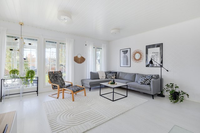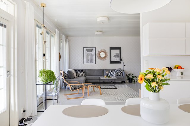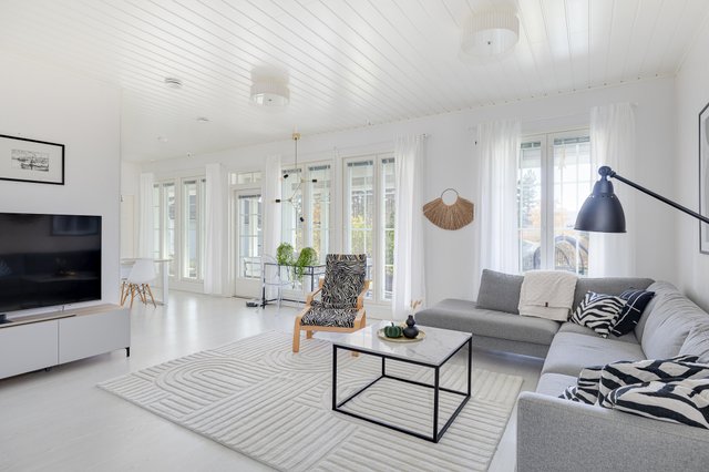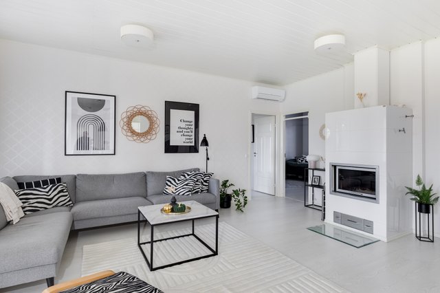 Olohuone ja koko asunto on korkeampi mitä yleensä (280cm) sekä olohuoneessa on lähes katosta lattiaan ulottuvat ikkunat, mikä antaa tilaan valoa ja tilantuntua. Olohuoneessa takka vielä kirsikkana kakun päällä.