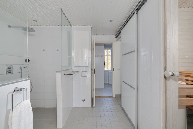 Tvättstugan har direkt ingång utifrån. Badrummet är utrustat med två duschar. Bastun är elektrisk, lagom stor och har dessutom ett fönster.