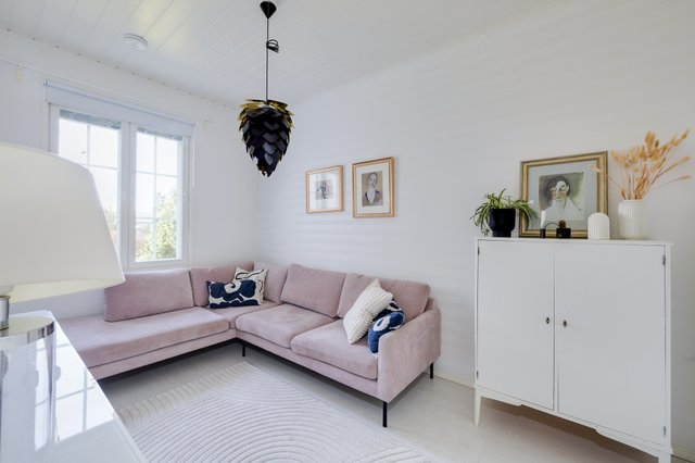 Vardagsrummet – liksom hela bostaden – har en högre takhöjd än normalt (280 cm), och de nästan golv-till-tak-höga fönstren ger rummet massor av ljus och rymd. Eldstaden i vardagsrummet blir verkligen pricken över i:et.