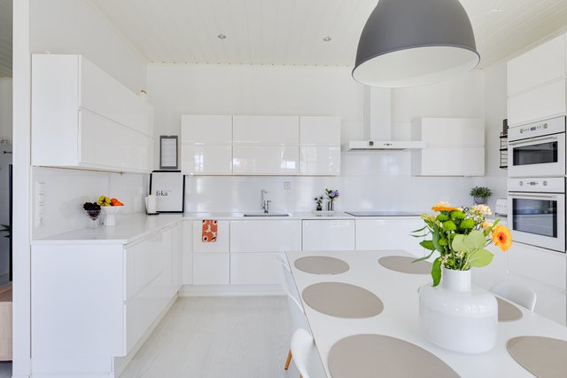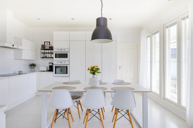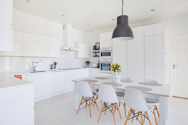 Keittiö on tilava ja käytännöllinen, ruokailutilaan mahtuu todella iso ruokapöytä.