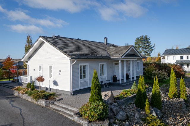 Ett gediget och stiligt Jetta-Sievi-hus blir nu tillgängligt för nya ägare – direkt från de ursprungliga byggarna. Enligt byggnadsritningarna är bostadsytan 149 m² och våningsytan 169 m², medan garagebyggnaden har en våningsyta på 58 m².