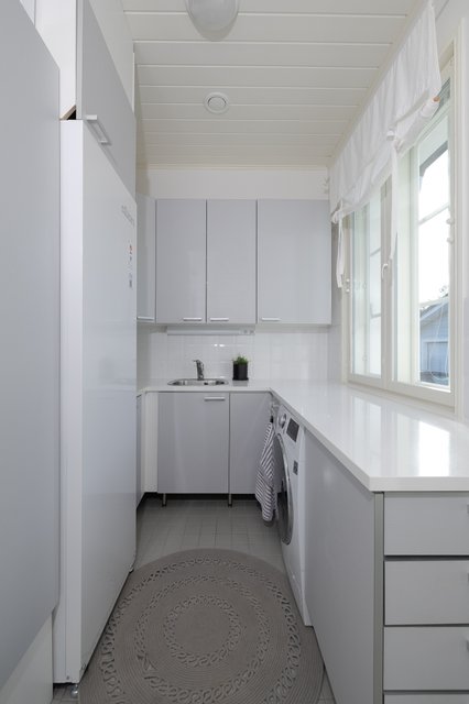 - Pesukoneliitäntä, lattialämmitys, pesuallas, lattiakaivo, silityspöytä/taso, pyykkikaapit, ja pöytätaso