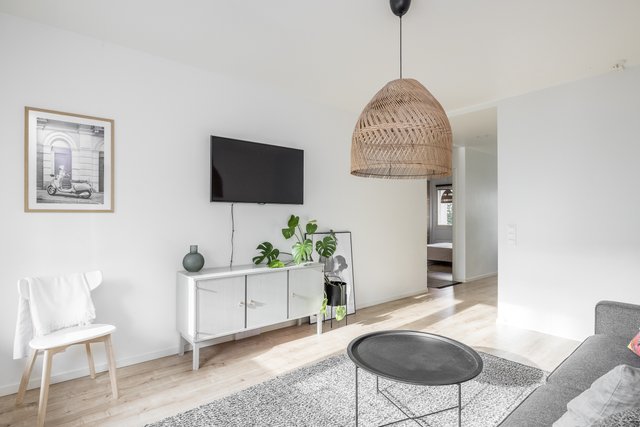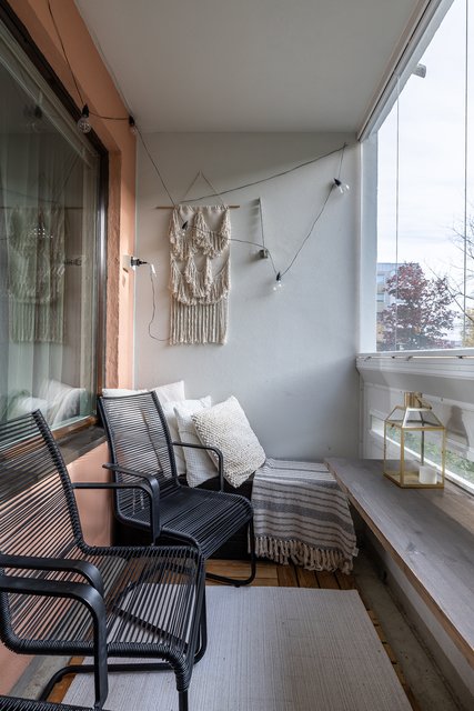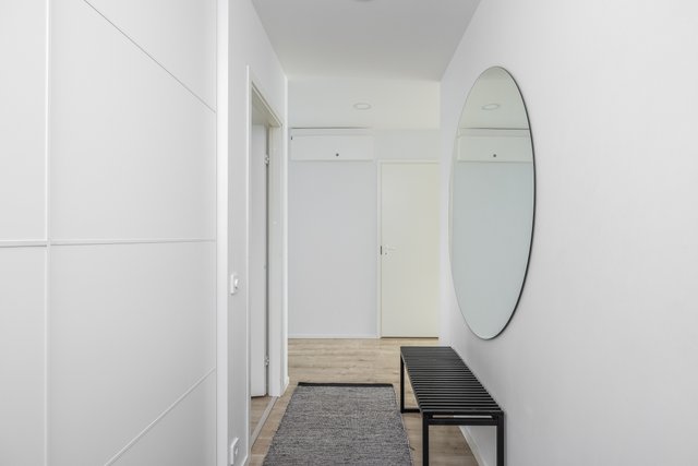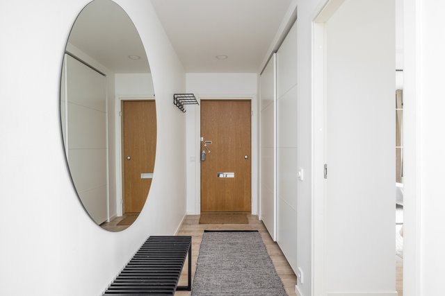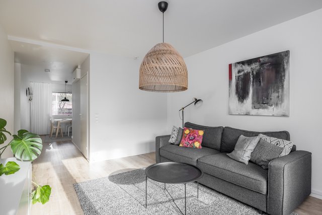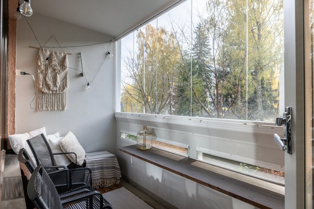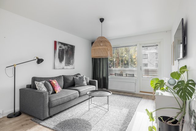 Integroiduin kodinkonein varusteltu linjakas keittiö tarjoaa kaikki kaipaamasi toiminnallisuudet, esteettisyydestä ja säilytystilasta tinkimättä. Ikkunallisessa keittiössä sopii mainiosti myös ruokailemaan. Tilavaan olohuoneeseen sijoitat vaivattomasti esimerkiksi työpisteen. Olohuoneen jatkeena toimii lasitettu parveke, josta on