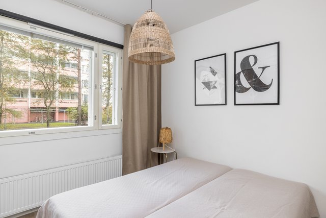 näkymät taloyhtiön suojaisalle piha-alueelle. Sekä makuuhuoneessa että eteisessä on mukavasti kaappitilaa. Ajattomin materiaalein viimeistelty, käytännöllinen kylpyhuone kruunaa kokonaisuuden! Lattialämmitys takaa käyttömukavuuden, ja arjen pyykkihuollolle löytyy paikkansa.