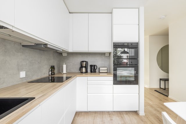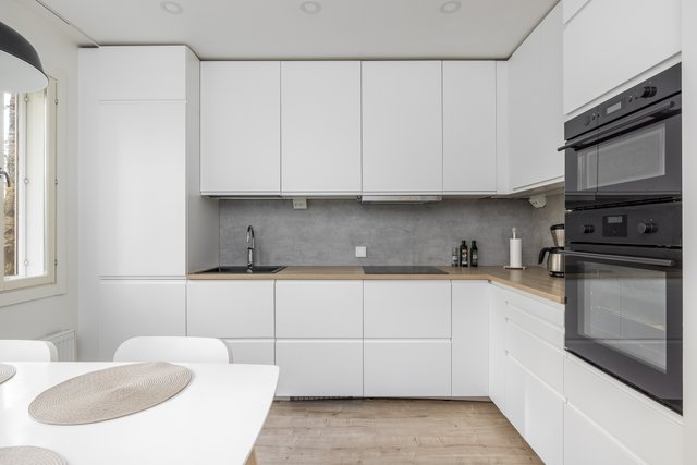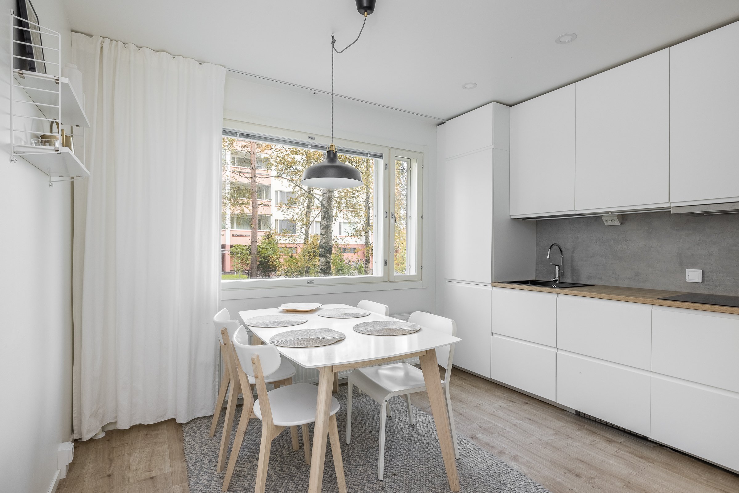 - Keittiön varustukseen kuuluvat integroidut kodinkoneet: induktioliesi, liesituuletin, kalusteuuni, mikroaaltouuni, astianpesukone ja jääkaappi-pakastin. Työtaso on laminaattia. Yläkaappien alla kiinteä valaistus. Lattia on laminaattia, seinät maalatut. Keittiö on uusittu vuonna 2016-2017.