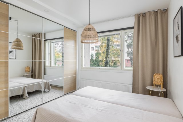 - Makuuhuoneen lattia on laminaattia, seinät maalatut. Liukuovikaapisto, osin peiliovella.