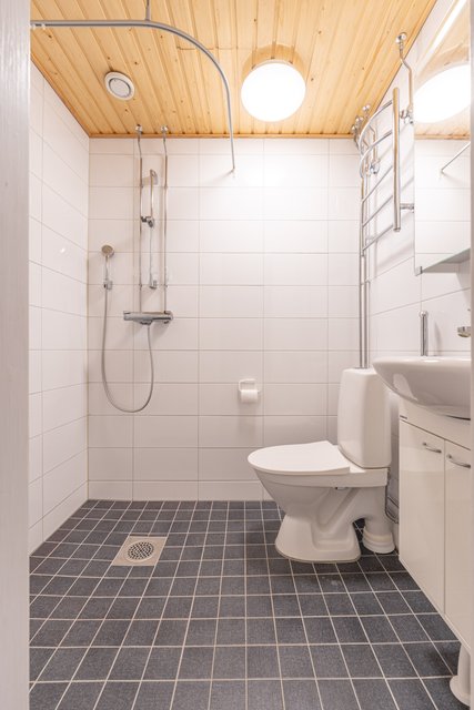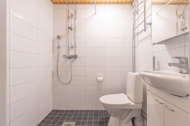 - WC-istuin, suihku, pesukoneliitäntä, peilikaappi, lattialämmitys (sähköllä), ja pesuallas