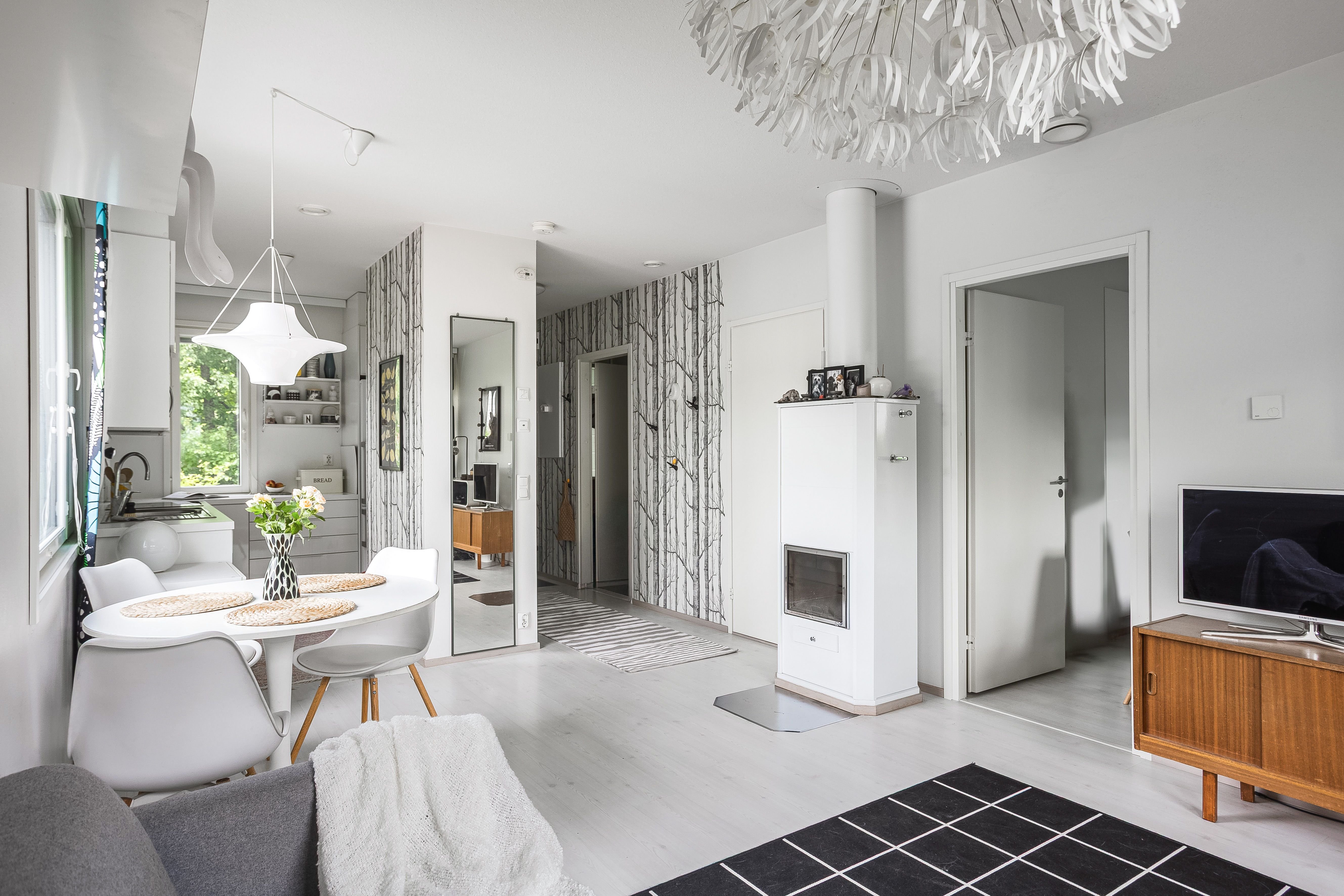 Olohuone, ruokailutila ja avokeittiö muodostavat yhtenäisen tilan oleskelulle. Olohuoneeseen ja keittiöön tulvii valoa suurista ikkunoista. Olohuoneesta on käynti katetulle terassille ja siitä edelleen omalle suojaisalle huoneistopihalle, joka rajautuu puistoalueeseen. Terassialue pihoineen jatkaa oleskelutiloja pihalle asti keväästä pitkälle syksyyn. Omalla pihalla on tilaa rentoutumiselle ja ulkona viihtymiselle!