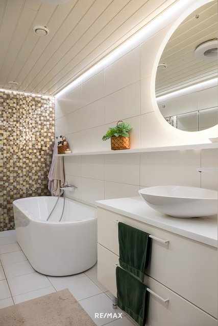 - Suihku, kylpyamme, lattialämmitys, peilikaappi, pesuallas, ja allaskaappi
