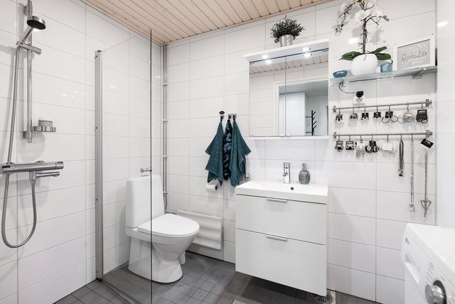- WC-istuin, suihku, suihkuseinä, pesukoneliitäntä, lattialämmitys, peilikaappi, allaskaappi, bidee-suihku, ja kaappi