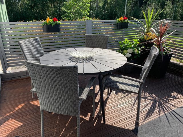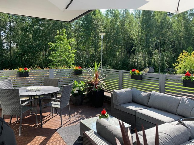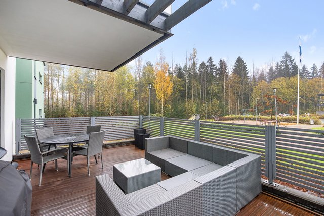 Avokeittiö ja olohuone muodostavat yhtenäisen oleskelutilan, jossa on mukava viettää aikaa. Olohuoneesta on käynti etelään suuntautuvalle terassille, josta näkymät sisäpihalle ja metsään. Tämä luo ihanteellisen paikan nauttia rauhallisista hetkistä alkukeväästä pitkälle syksyyn.