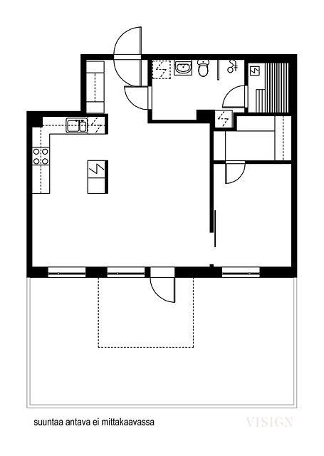 - Mahdollisuuksien olohuone, jossa useampi paikkavaihtoehto ruokapöydälle ja sohvalle. Iso asunnon levyinen terassialue viihtyisänä olohuoneen jatkeena.
