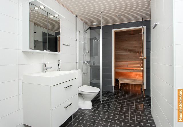 - Lattialämmitys, suihkuseinä, wc-istuin, peilikaappi, ja pesukoneliitäntä