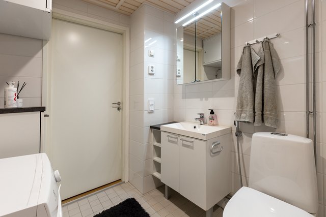 - WC-istuin, suihkuseinä, pesukoneliitäntä, peilikaappi, ja allaskaappi