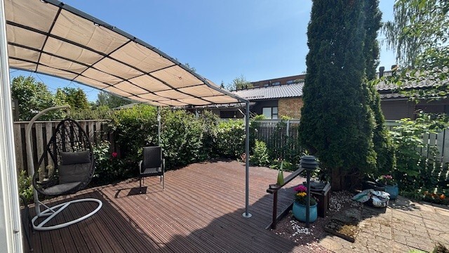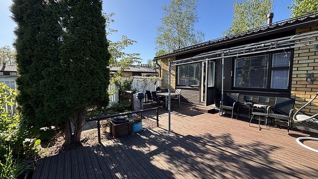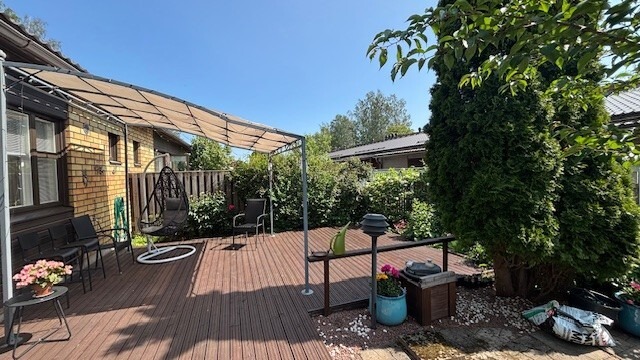 Talon levyinen patioalue aidatulla takapihalla on täydellinen rauhan tyyssija. Voit nauttia aurinkoisista kesäpäivistä, grillata perheen kanssa tai vain rentoutua omassa rauhassasi.