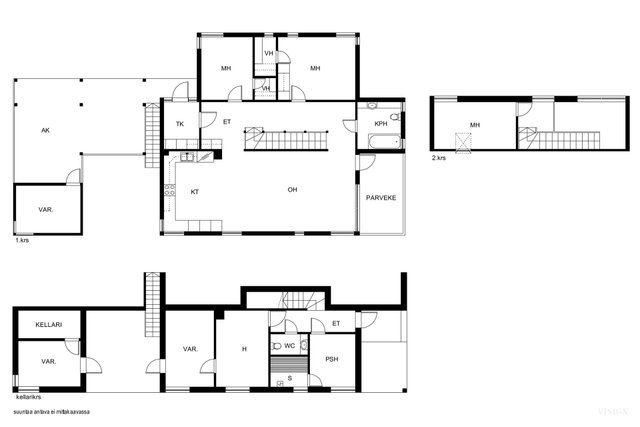 Kellarikerroksessa sijaitsee sauna, pesuhuone wc, takkahuone ja tekninen tila / varasto.