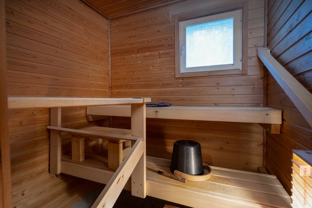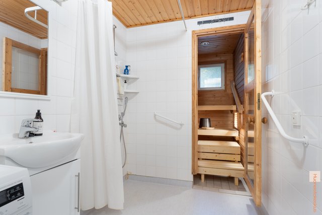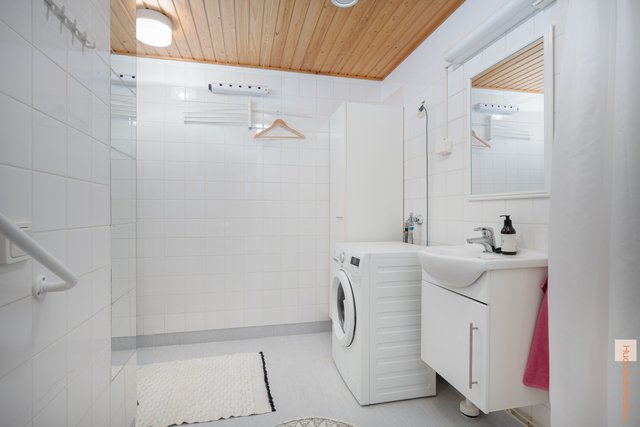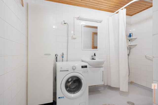 - Pesuhuone ja sauna puupaneeli, muissa tiloissa roiskemaalattu levykatto.