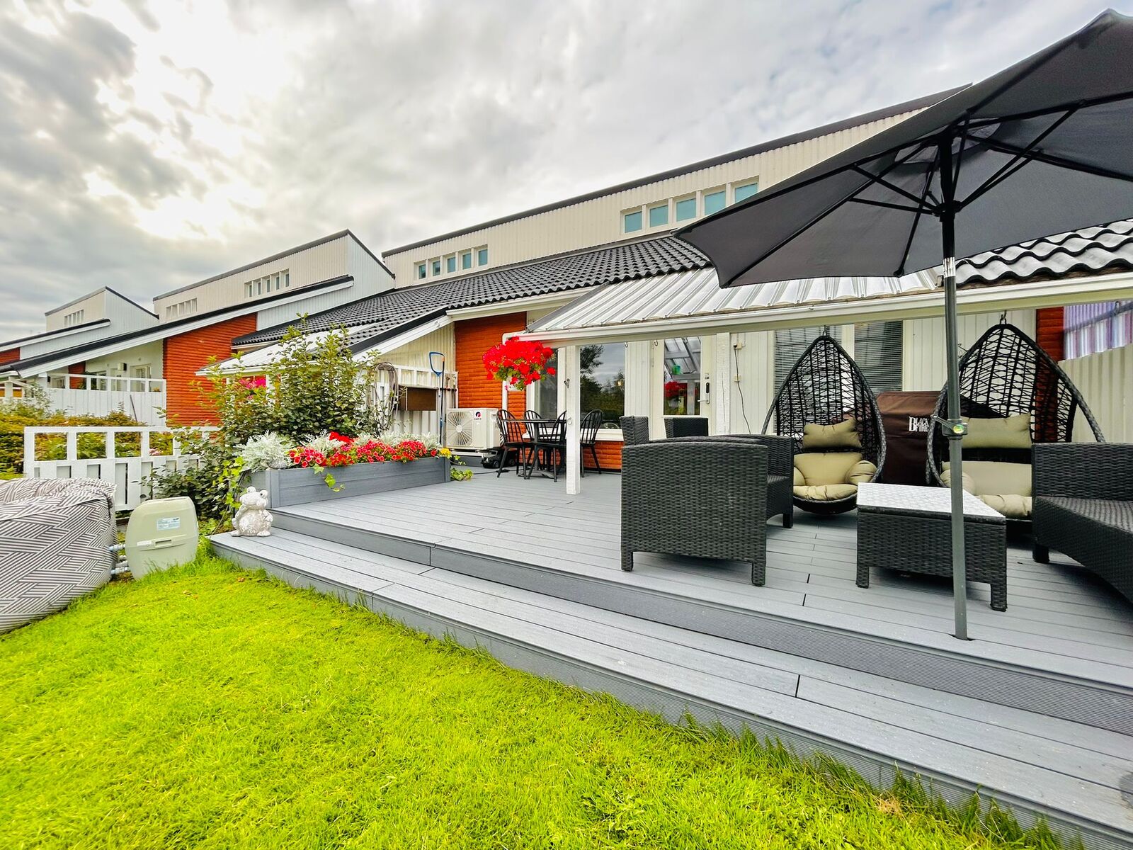 Takapihan puolelle jää mukavasti oleskelutilaa suurelle 30m2 terassille, josta löytyy myös katettua tilaa. Terassin lattia on helppohoitoista ja laadukasta komposiittia.