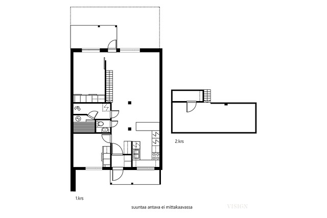 Keittiössä on kaikki toiminnot lähellä toisiaan ja ruokailuryhmälle jää hyvin tilaa keittiön ja olohuoneen väliin. Alakerran makkari toimii hyvin myös työpisteenä tai erillisenä tv-huoneena. Parvelta löytyy tilaa kahdelle levitettävälle sohvalle tai erilliselle työpisteelle. Parvella säilytystilana vaatehuone.