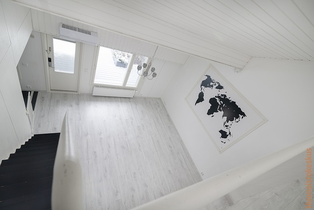 Ilmalämpöpumpun sisäyksiköt olohuoneessa ja suuremmassa makuuhuoneessa. Valoisan olohuoneen huonekorkeus on yli 4,6 metriä.