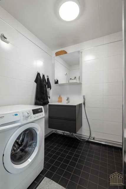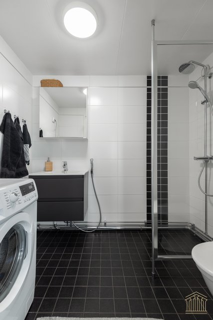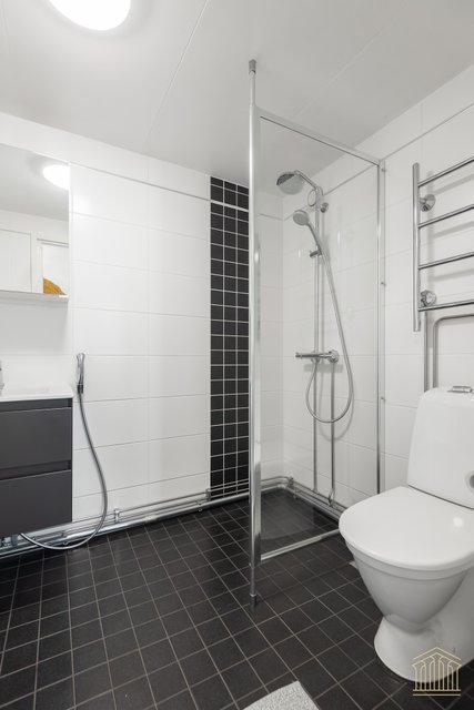 - WC-istuin, suihku, suihkuseinä, pesukoneliitäntä, bidee-suihku, allaskaappi, ja peilikaappi