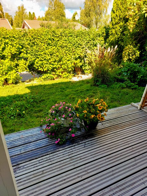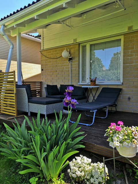 - Kaatettu terassi ja suojaisa verkolla aidattu piha.