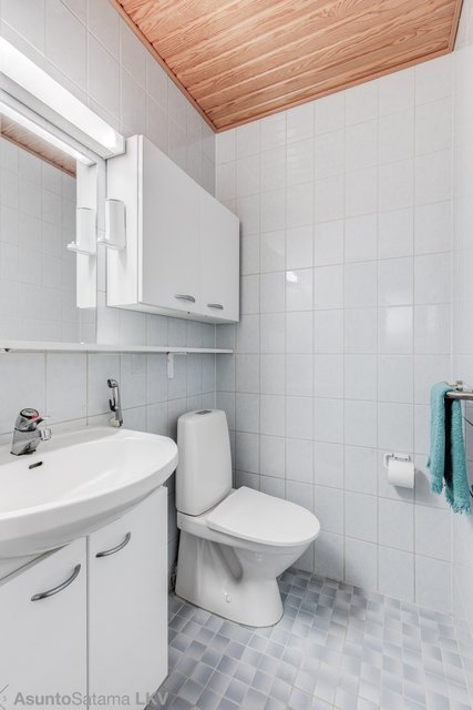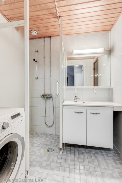 - Suihku, suihkuseinä, pesukoneliitäntä, lattialämmitys, peili, pesuallas, ja allaskaappi