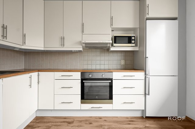 - Jääkaappipakastin, astianpesukone, liesituuletin, uuni, ja liesi