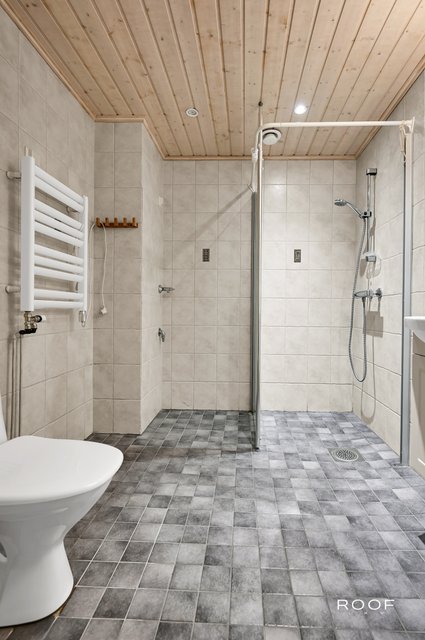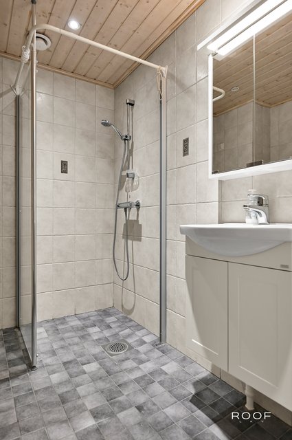 - WC-istuin, suihkuseinä, lattialämmitys, peilikaappi, allaskaappi, pesukoneliitäntä, ja pesuallas