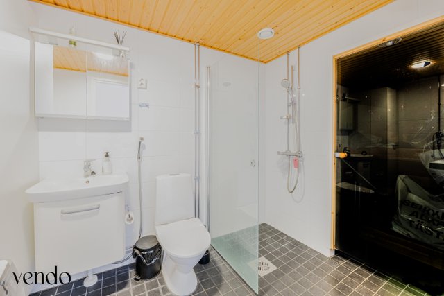 - WC-istuin, suihku, suihkuseinä, pesukoneliitäntä, peilikaappi, peili, pesuallas, allaskaappi, ja bidee-suihku