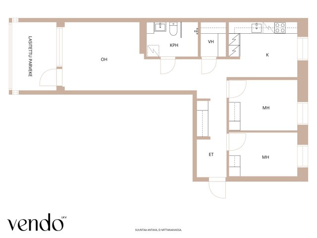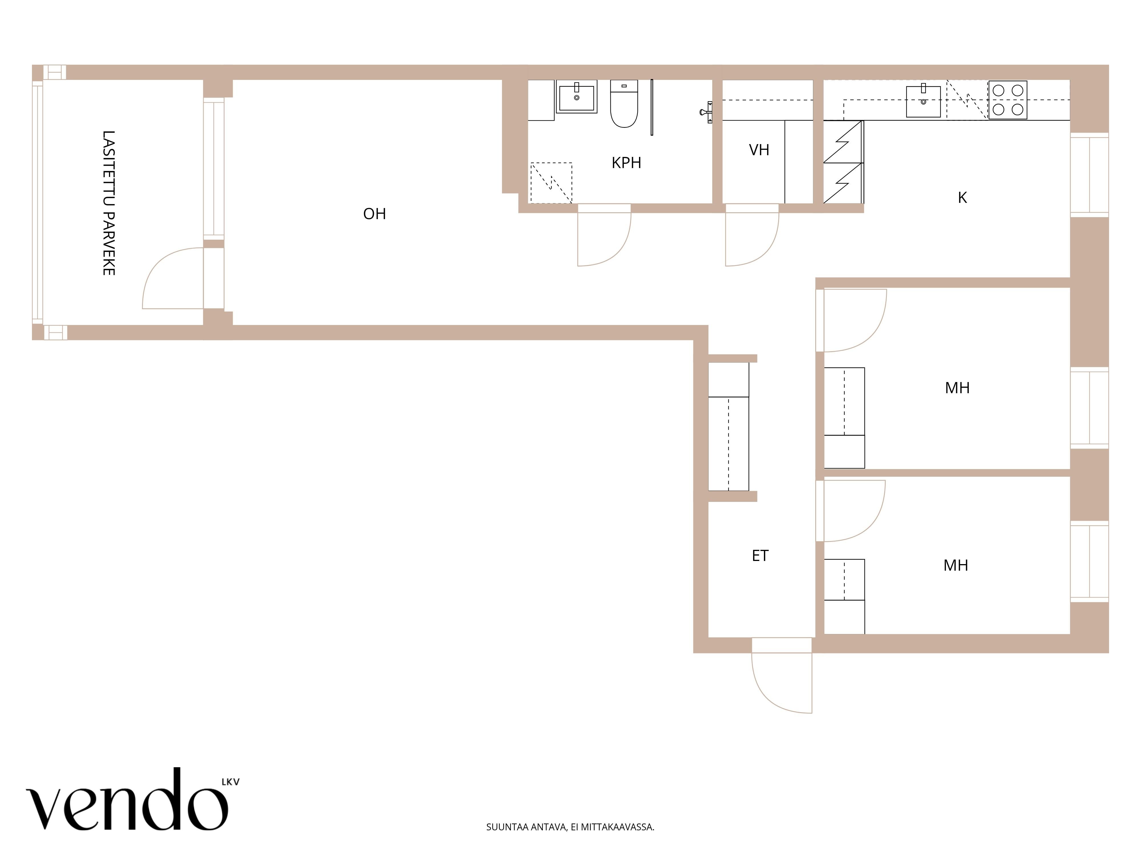 - Jääkaappi, erillinen pakastin, uuni, liesi, liesituuletin, ja astianpesukone